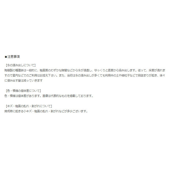 | 備考 | ・焼成時に起きる小キズ・釉薬の乱れ・剥がれなどが多少ございます。 ・室内で使用される場合には必ず水受け皿を使用してください。 ・底面はキレイに成形されているわけでは御座いませんので、移動される場合に引きずると床面に傷つける場合が御座います。 ・商品の色はPCと異なって見える場合があり、またPCによっても異なります。色がイメージと異なるという理由では返品は承りかねますので、予めご了承ください。 |