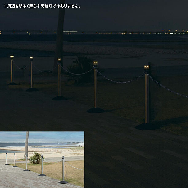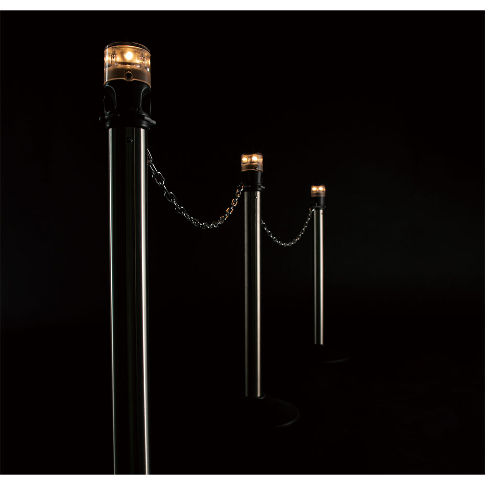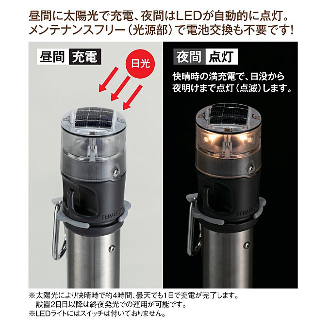 ●太陽光発電付きLEDライトで夜間でも存在感をアピール!昼夜天候を問わず活躍するチェーン内蔵式スタンドです。