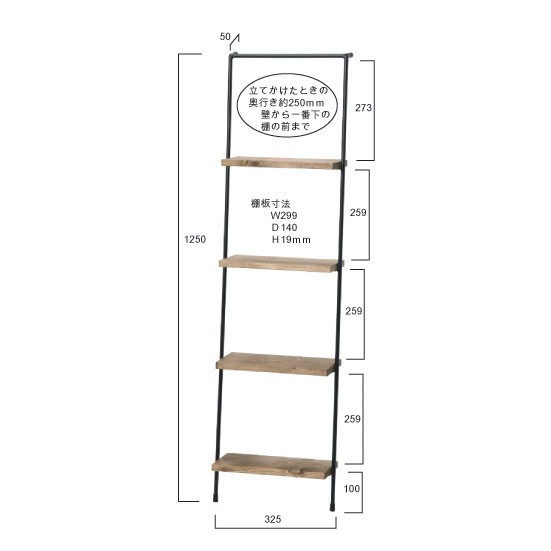 | サイズ | 本体:横幅32.5cm×奥行5cm×高さ125cm 棚板:横幅29.9cm×奥行14cm×高さ1.9cm ※立てかけたときの奥行は約25cm(壁から一番下の棚前まで) |