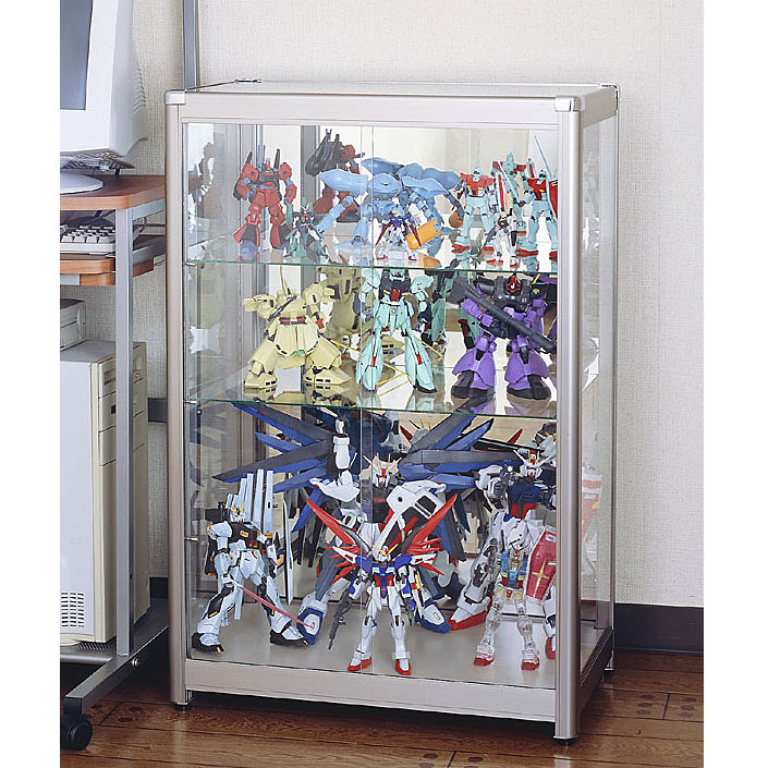 | 材質 | 天板・正面・側面:熱処理ガラス(板厚3.3mm) 棚板2枚:熱処理強化ガラス(板厚5mm) 床板:熱処理強化ガラス(板厚4mm)・角斜加工2枚(中間棚板用 1枚) 背面:ミラーガラス(板厚3.0mm) フレーム「ステンカラー」:アルミ製・アルマイト仕上 棚受ダボ(ネジ式):スチールメッキ仕上(シリコンキャップ付) |