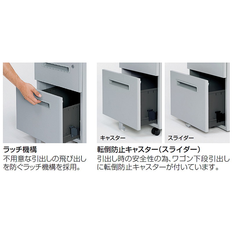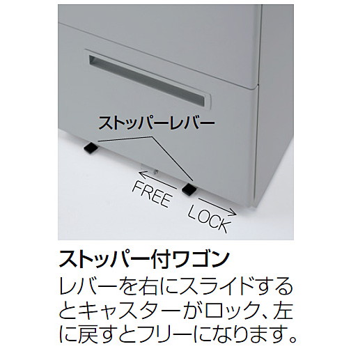 ●低床A4×2段のオフィス用ワゴンです。1つの鍵で片袖全部の引出しがロックできます。