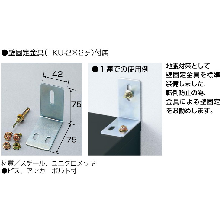 | 材質 | 本体:スチール製、粉体塗装(抗菌加工) 扉:スチール製、粉体塗装(抗菌加工) 取手:ABS樹脂(一部抗菌加工) 壁固定金具:スチール、ユニクロメッキ |