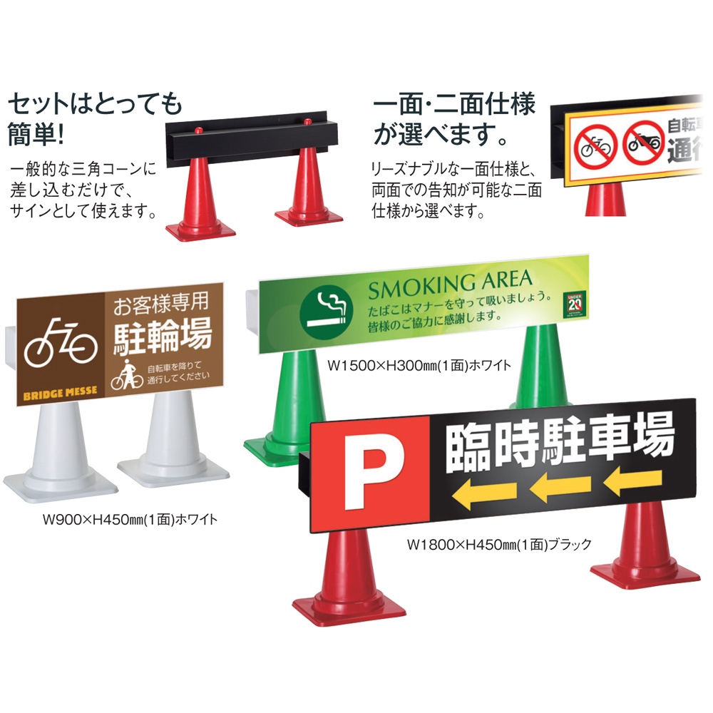 ●三角コーンにセットできる樹脂製サイン。リーズナブルな1面使用と、両面での告知が可能な2面仕様から選べます。一般的なコーンに差し込むだけでサインとしてお使いいただけます。