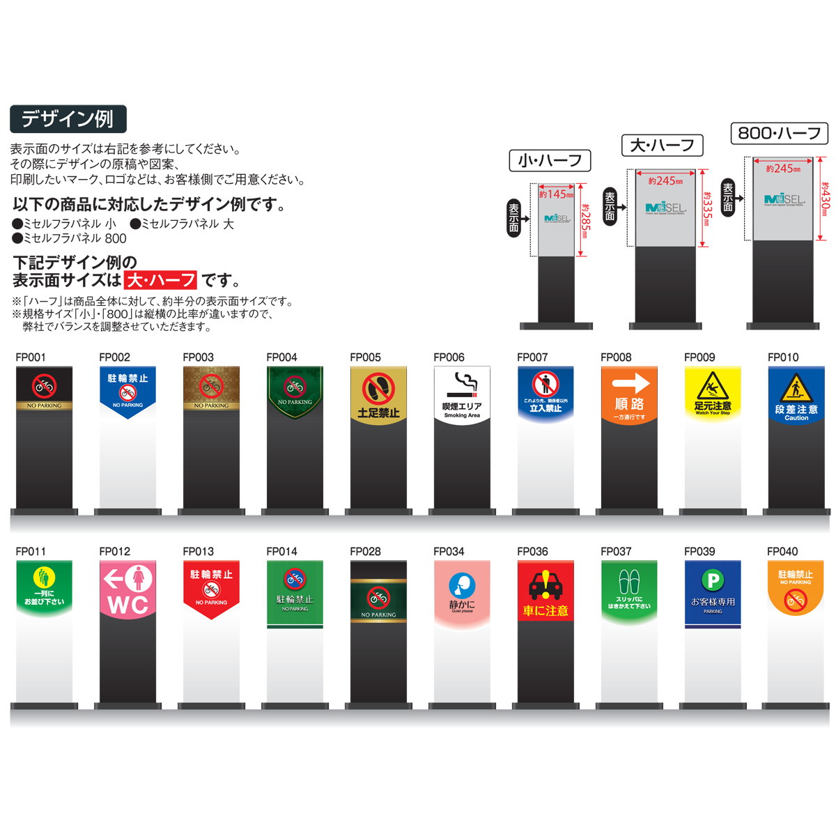 | 備考 | ・表示面が全面タイプの約半分のタイプです。 ・表示面はデザインテンプレートからお選び頂くか、オリジナルデザインも可能です。オリジナルデザインの場合はご注文後、ご希望の表示面の内容をメールにてお送りください。 ・表示面は2面ありますが、ベースとなるデザインは1つまでとなります。複数の異なるデザインを使用する場合は別途料金がかかります。 ・価格にはシート印刷、貼り工賃を含んでおります。 ・塩ビ系床材などに設置の場合、ゴムに含まれる成分が移行して床材を変色させることがあります。床材とゴムが直接触れないよう、保護シートなどをはさんで設置してください。 ・商品の色はPCと異なって見える場合があり、またPCによっても異なります。色がイメージと異なるという理由では返品は承りかねますので、予めご了承ください。 |