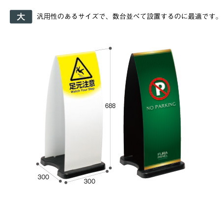 | 備考 | ・表示面が全面タイプの約半分のタイプです。 ・表示面はデザインテンプレートからお選び頂くか、オリジナルデザインも可能です。オリジナルデザインの場合はご注文後、ご希望の表示面の内容をメールにてお送りください。 ・表示面は2面ありますが、ベースとなるデザインは1つまでとなります。複数の異なるデザインを使用する場合は別途料金がかかります。 ・価格にはシート印刷、貼り工賃を含んでおります。 ・塩ビ系床材などに設置の場合、ゴムに含まれる成分が移行して床材を変色させることがあります。床材とゴムが直接触れないよう、保護シートなどをはさんで設置してください。 ・商品の色はPCと異なって見える場合があり、またPCによっても異なります。色がイメージと異なるという理由では返品は承りかねますので、予めご了承ください。 |