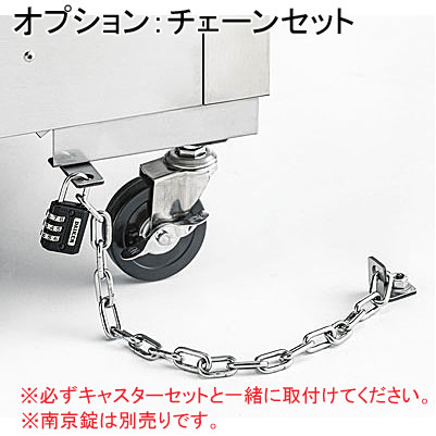 ●オプションのチェーンセットは、キャスターを取付けた際の盗難対策として、本体にチェーンを取付けられます。チェーンセットのみでは取付けできませんので、必ず、キャスターセットと一緒に取付けてください。