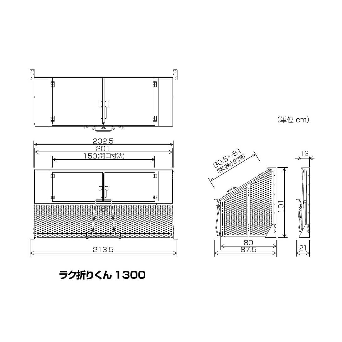使用時:213.5cm(幅)×87.5cm(奥行)×101cm(高さ) 折りたたみ時:213.5cm(幅)×21cm(奥行)×101cm(高さ) 開口寸法:150cm(幅)×80.5cm(奥行) |