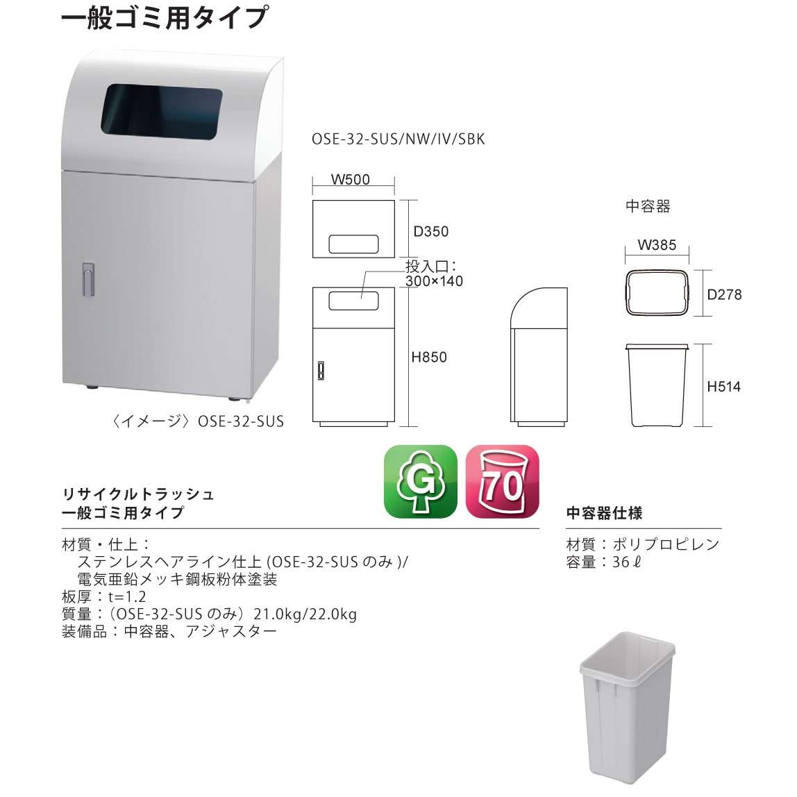 | 商品名 | リサイクルトラッシュ 一般ゴミ用タイプ 幅500mm ステンレスヘアライン仕上 OSE-32-SUS |