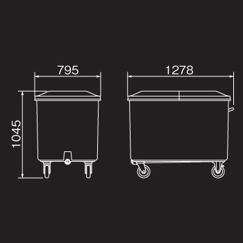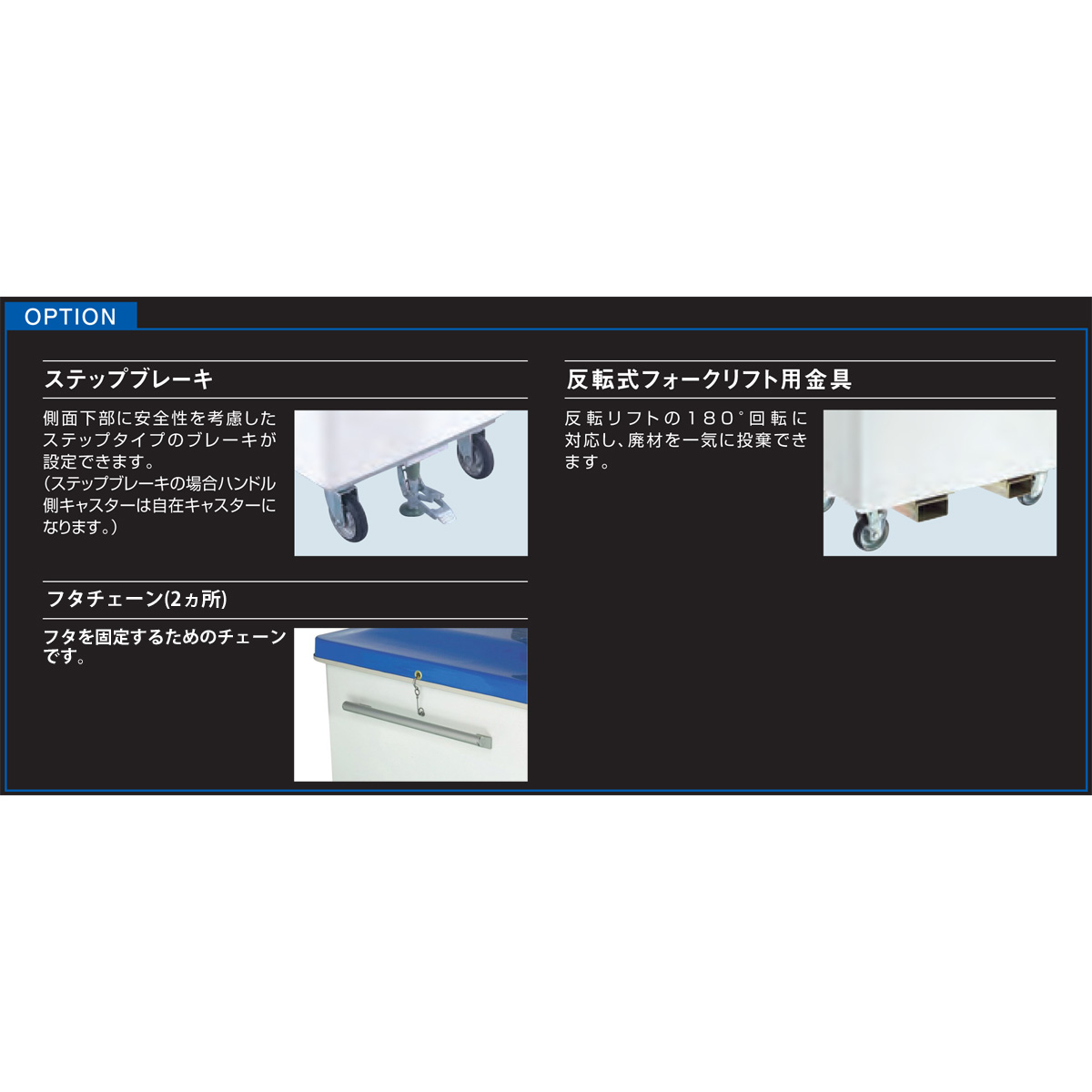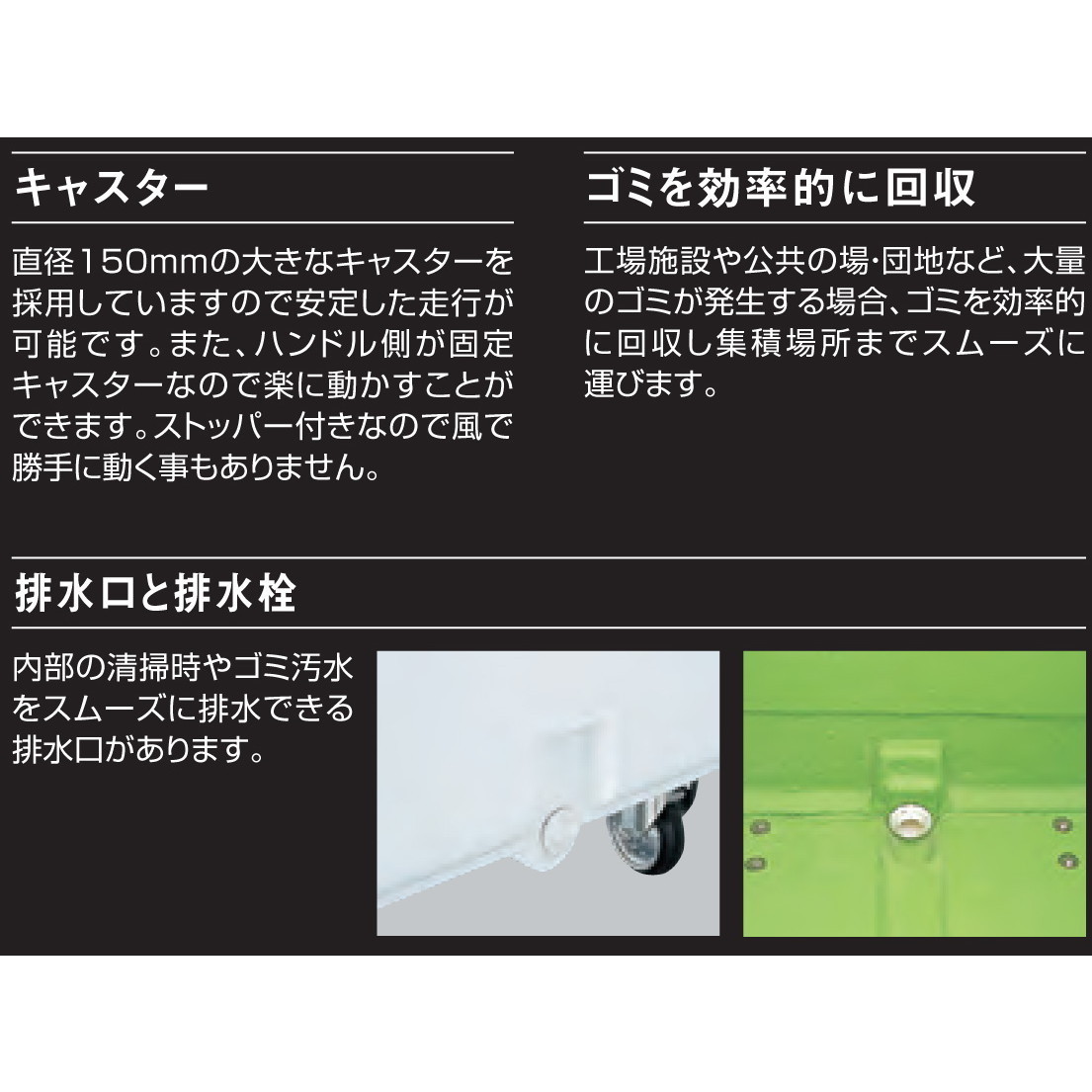 ●軽量設計で作業性抜群、連結も可能です。容量700リットルの直径15cmキャスター付き集積搬送保管車です。ハンドルがついているので、容器に直接触れずに搬送できます。
