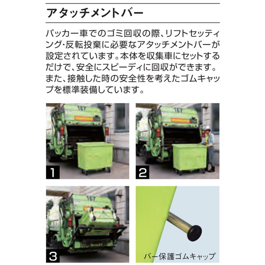 ●パッカー車でのゴミ回収の際、リフトセッティング・反転投棄に必要なアタッチメントバーが設定されています。