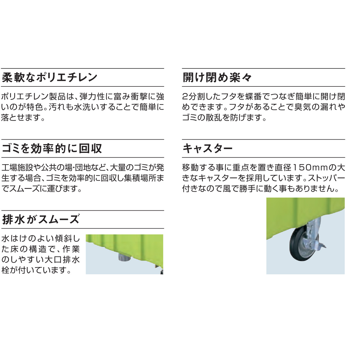 ●生ゴミ回収に便利な反転式、作業効率大幅アップ。工場施設や公共の場・団地など大量のゴミが発生する場合、ゴミを効率的に回収し集積場所までスムーズに運びます。
