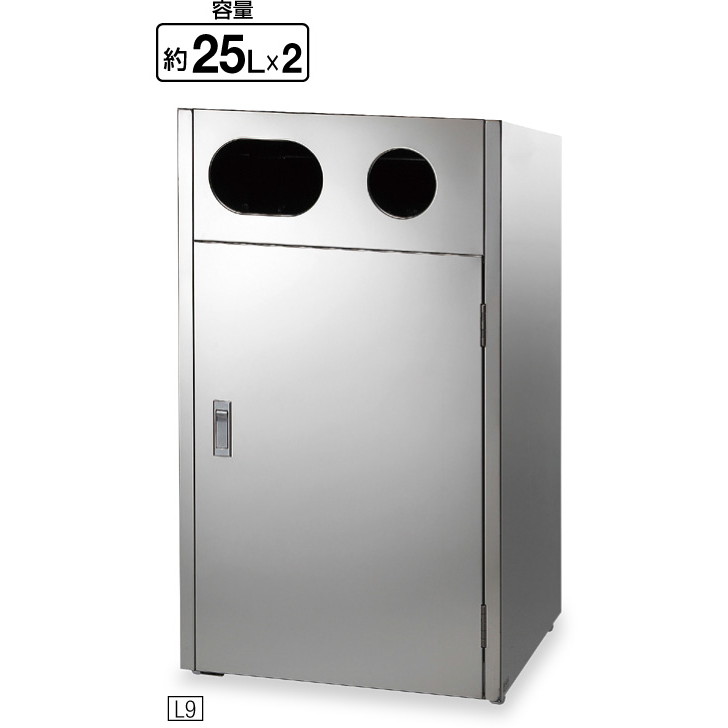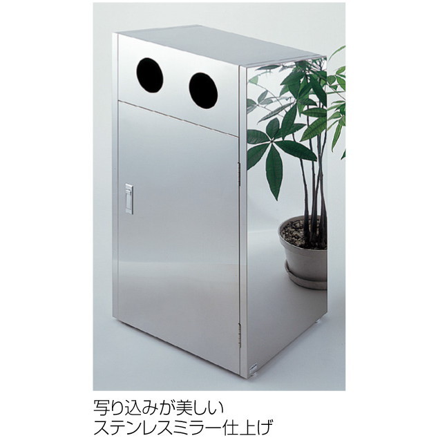 ●美しいミラー仕上げの屋外用くず入れ。耐久性に優れたステンレス製です。単体2分別の投入口2つタイプです。容量は約50リットル(25リットル×2)です。