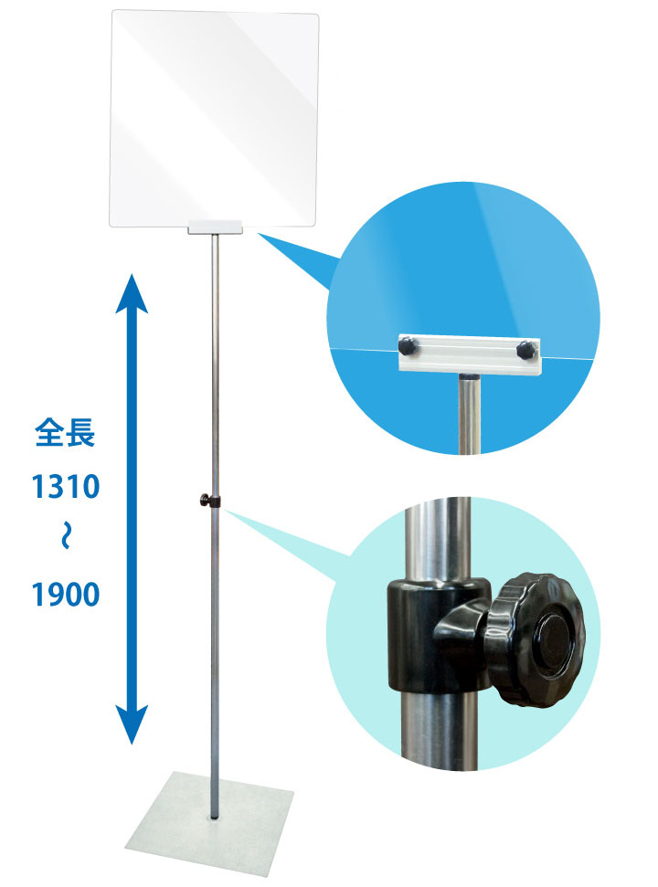 自立するスタンドタイプは、身長に合わせてアクリル板の高さを調節することができます。