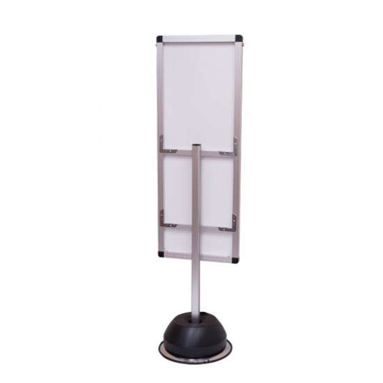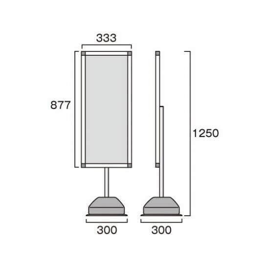 ■製品仕様●ベース=φ300/スチール製/表面コートステンレス●パネル・ポール=アルミ押出し材/アルマイト仕上(ブラック) ●面板=アルミ複合板(白)3mm厚●表面カバー=アクリル(透明)1.5mm厚●水タンク(ブラック)注水容量=3リットル※屋内・屋外可(ポスターには耐水加工が必要です)●ポスターサイズ=A3TT(W297mm×H841mm)●面板有効サイズ=W281mm×H825mm●重量=7.8kg(注水時)