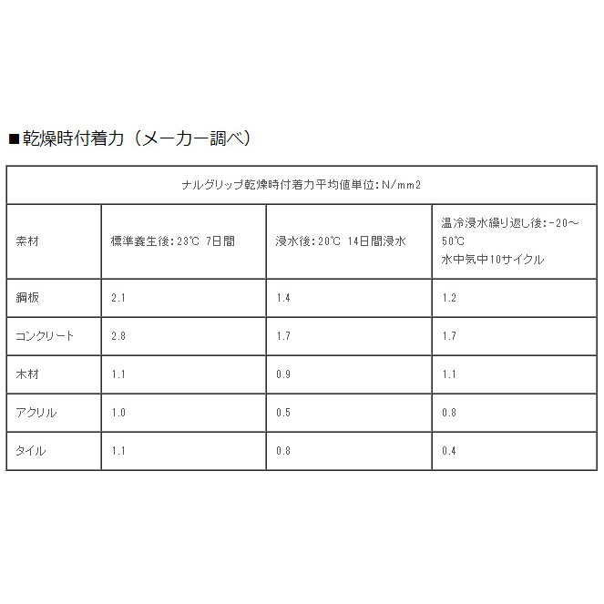 | 使用可能素材 | コンクリート、アスファルト、金属板、石材、木板など。 ※一部の樹脂床や水没する平滑面では接着強度が落ちます。 ※素足で歩く場所には向いていません。 |