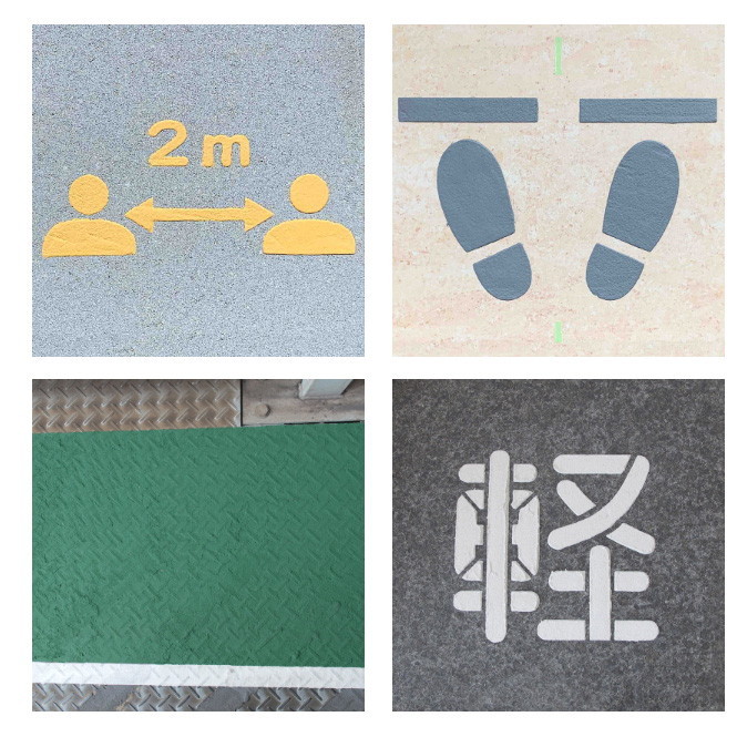 | 使用可能場所 | 玄関、排水溝のフタ、グレーチング、坂道、踏み台の天板、仮設歩車道、工場などの設備内の安全用塗装、凍結しやすい路面 |