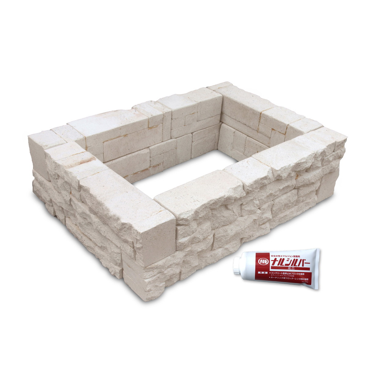 | セット内容 | ブリックブロック21 モノホワイト×4個(1個約幅21×奥行9×高さ10cm) ブリックブロック42 モノホワイト×8個(1個約幅42×奥行9×高さ10cm) 接着剤ナノシルバーミニ350g×1個