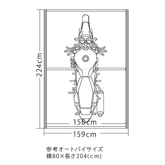 原付小型バイクから中型オフロード、ネイキッドタイプなど収納可能です。 また、ハーレースポーツスターも収納可能です。 ※対応車種はあくまで目安になりますので、バイクの長さ、幅、高さを計測の上ご注文お願いします。 |