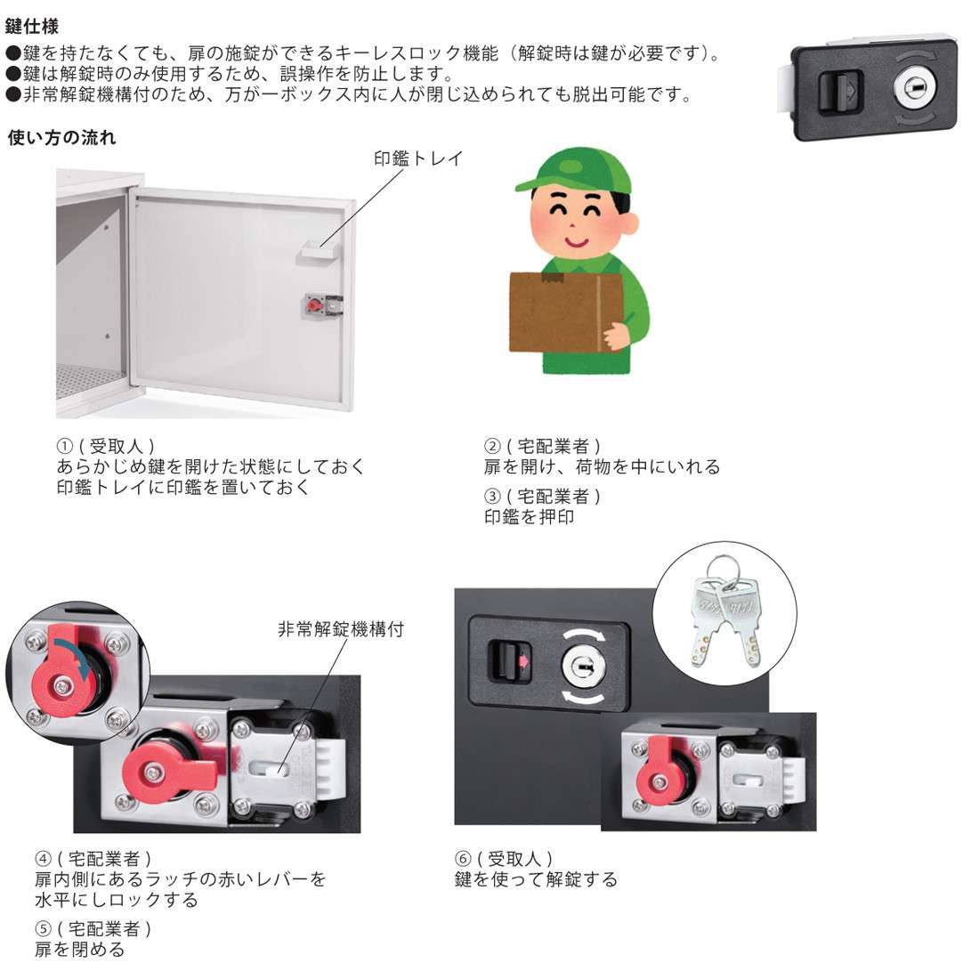 | 備考 | ・鍵を持たなくても、扉の施錠ができるキーレスロック機能。(解錠時は鍵が必要です。) ・鍵は解錠時のみ使用するため、誤操作を防止します。 ・非常解錠機構付のため、万が一ボックス内に人が閉じ込められても脱出可能です。 ・商品の色はPCと異なって見える場合があり、またPCによっても異なります。色がイメージと異なるという理由では返品は承りかねますので、予めご了承ください。 |