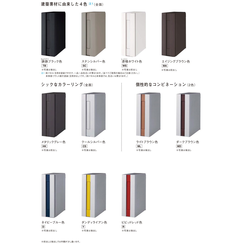 | 材質 | 本体:ZAM鋼板(高耐食溶融めっき鋼板) 前パネル・投函口:アルミダイカスト 後パネル(後出しは取出口蓋):PC樹脂(耐候性樹脂) |