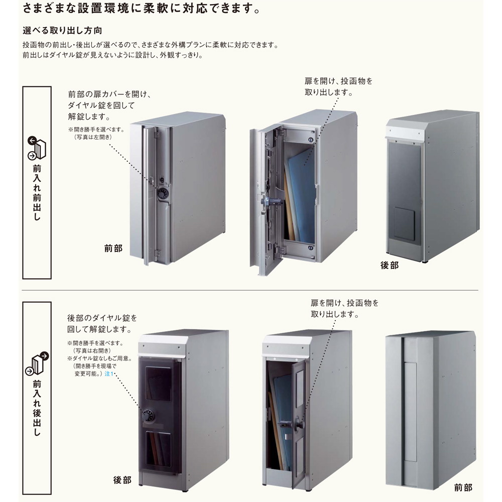 | 備考 | ・前入れ、前出しはダイヤル鍵付きです。 ・前入れ、後出しはダイヤル錠の有無を選択出来ます。ダイヤル錠は後付け出来ません。 ・ダイヤル錠付きは扉の向きを後から変更は出来ません。 ・ダイヤル錠無しは扉の向きを現場にて選択可能です。 ・商品の色はPCと異なって見える場合があり、またPCによっても異なります。色がイメージと異なるという理由では返品は承りかねますので、予めご了承ください。 |