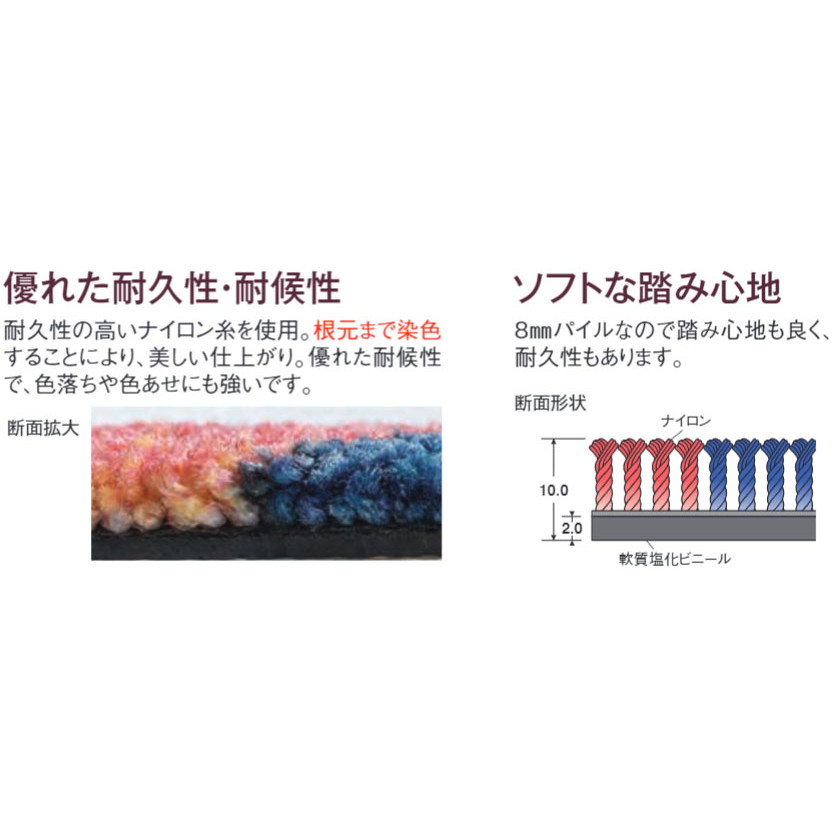 ●高耐久性、高品質の仕上がり。耐久性の高いナイロン素材を採用し、優れた堅牢性と耐候性を誇ります。パイルの根元まで染色。
