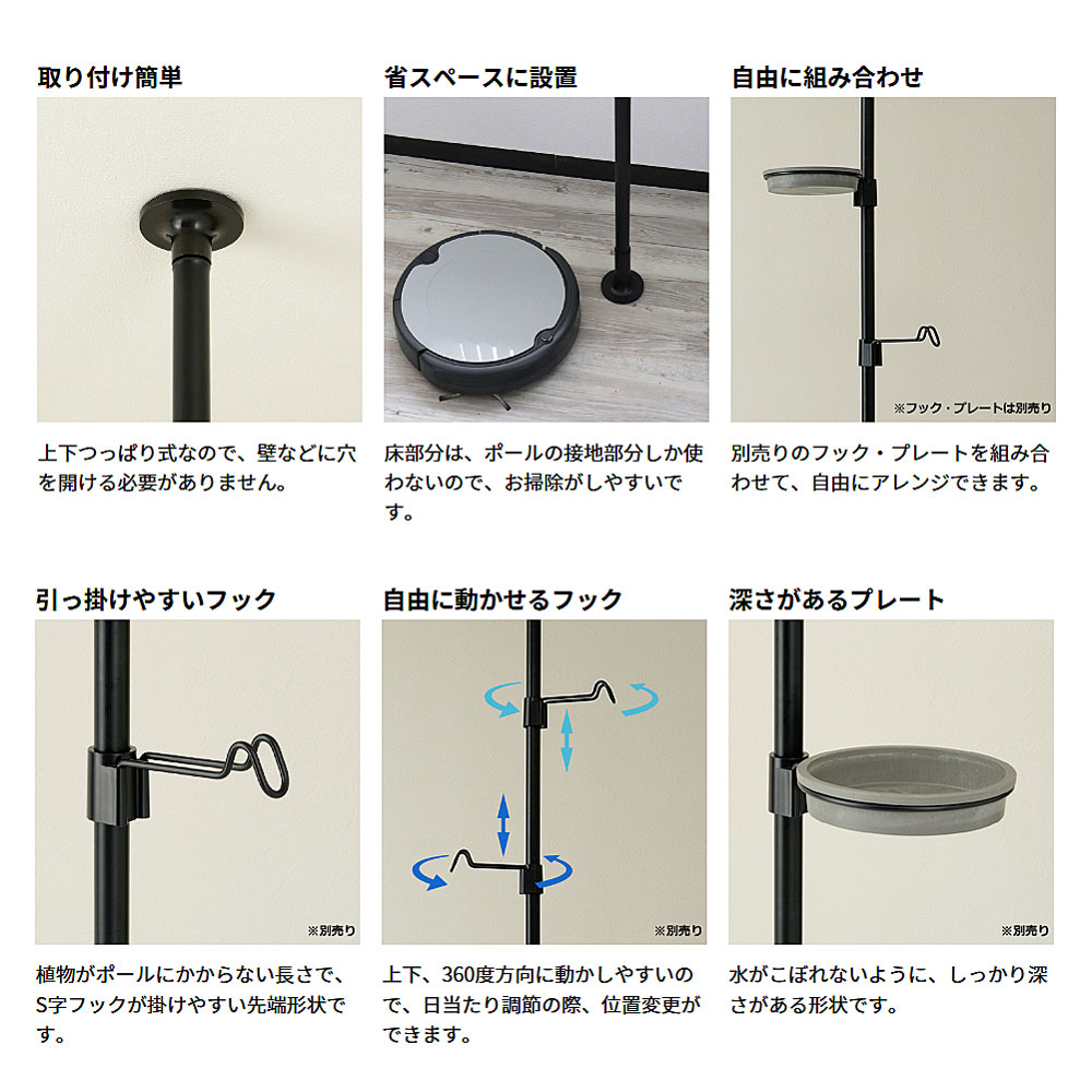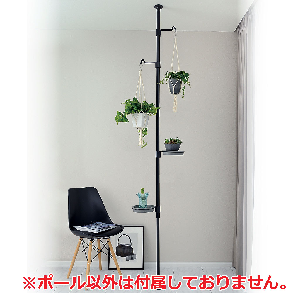 ●上下つっぱり式なので、壁などに穴を開ける必要がありません。空間を有効に使って吊鉢やポットに入れた植物を飾ることができます。