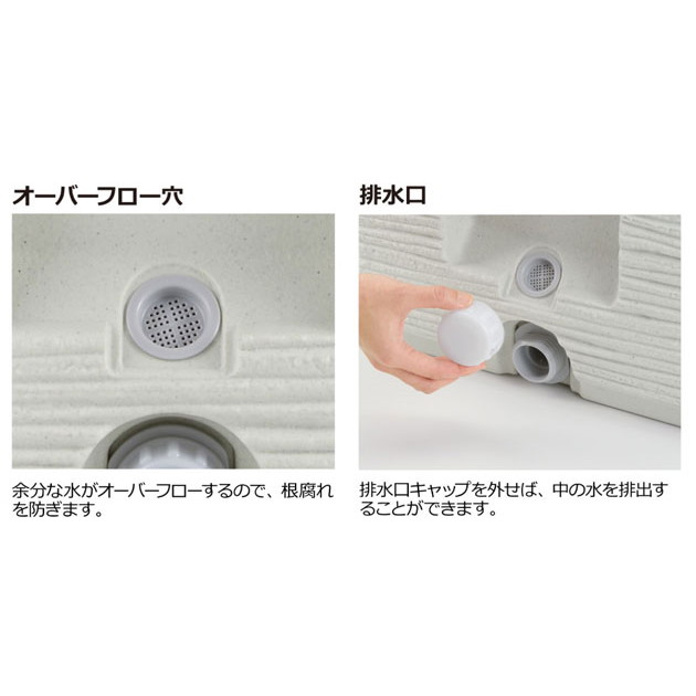 | 材質 | 本体・給水口キャップ・排水口キャップ:ポリエチレン 排水口・灌水脚・オーバーフローキャップ:ポリプロピレン パッキン:合成ゴム |