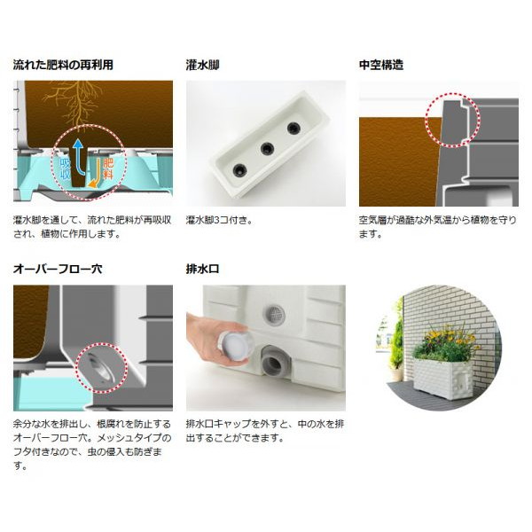 | 材質 | 本体・給水口キャップ・排水口キャップ:ポリエチレン 排水口・灌水脚・オーバーフローキャップ:ポリプロピレン パッキン:合成ゴム |