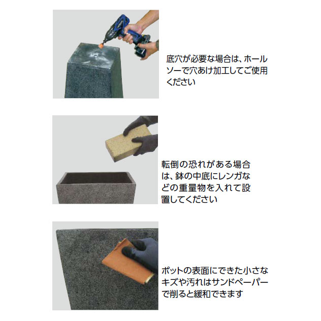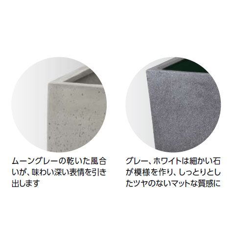 | 材質 | ポリテラゾ ※ポリテラゾとはポリレジンに石を練りこみ強度を高めた素材です。石を混ぜ合わせることで、プラスチックポットの軽い質感より重厚感がアップ。耐候性に優れ、色落ちもしにくくなっています。大理石調で、シンプルなデザインに仕上げました。 表面に汚れや傷ができた場合、サンドペーパーで削ると緩和します。塗料は材料に練り込んでいるので削っても色が変化しません。 |