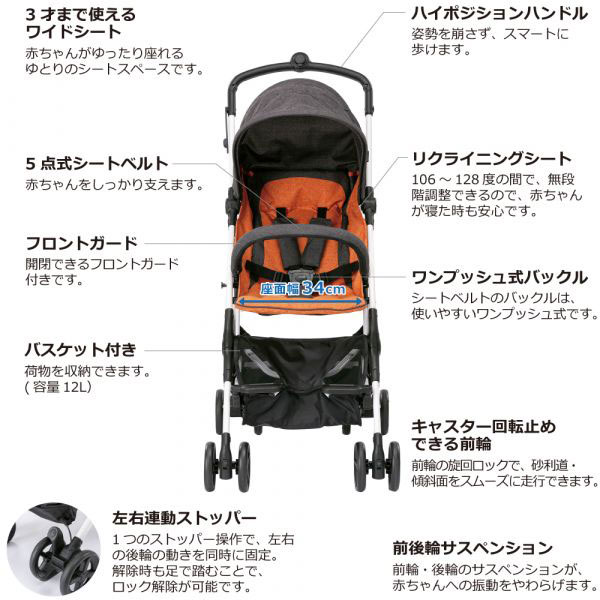 ●リクライニングシートは106~128度の間で無段階調整できるので、赤ちゃんが寝た時も安心です。