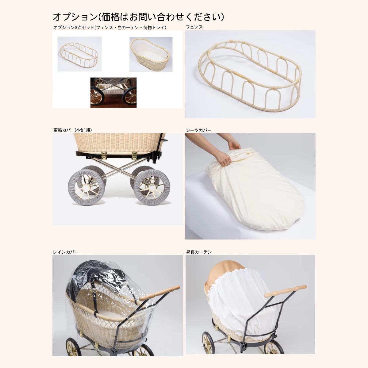| 材質 | フレーム:アルミニウム 脚:ステンレス タイヤ:発泡プラスチック 車輪ハブ:ABS ハンドル:鉄パイプ グリップ:天然木 バスケット:籐(とう) 幌(ほろ):綿プリント |
