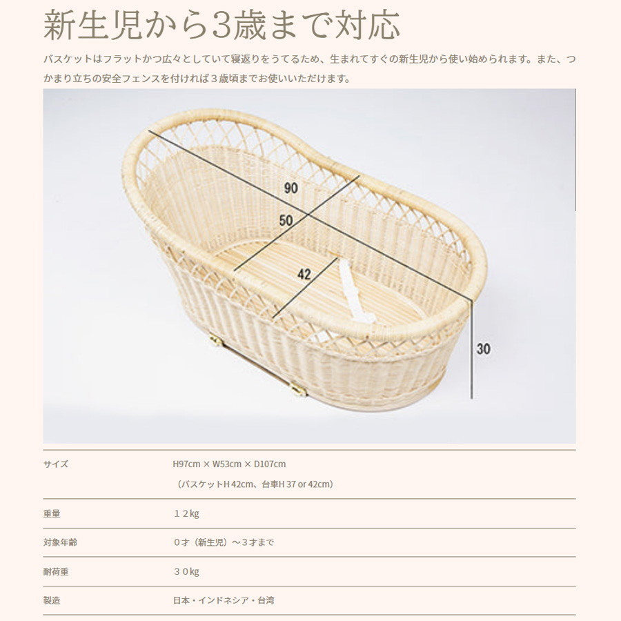 ●バスケットはフラットかつ広々としていて寝返りをうてるため、生まれてすぐの新生児から使い始められます。また、つかまり立ちの安全フェンスを付ければ3歳頃までお使いいただけます。