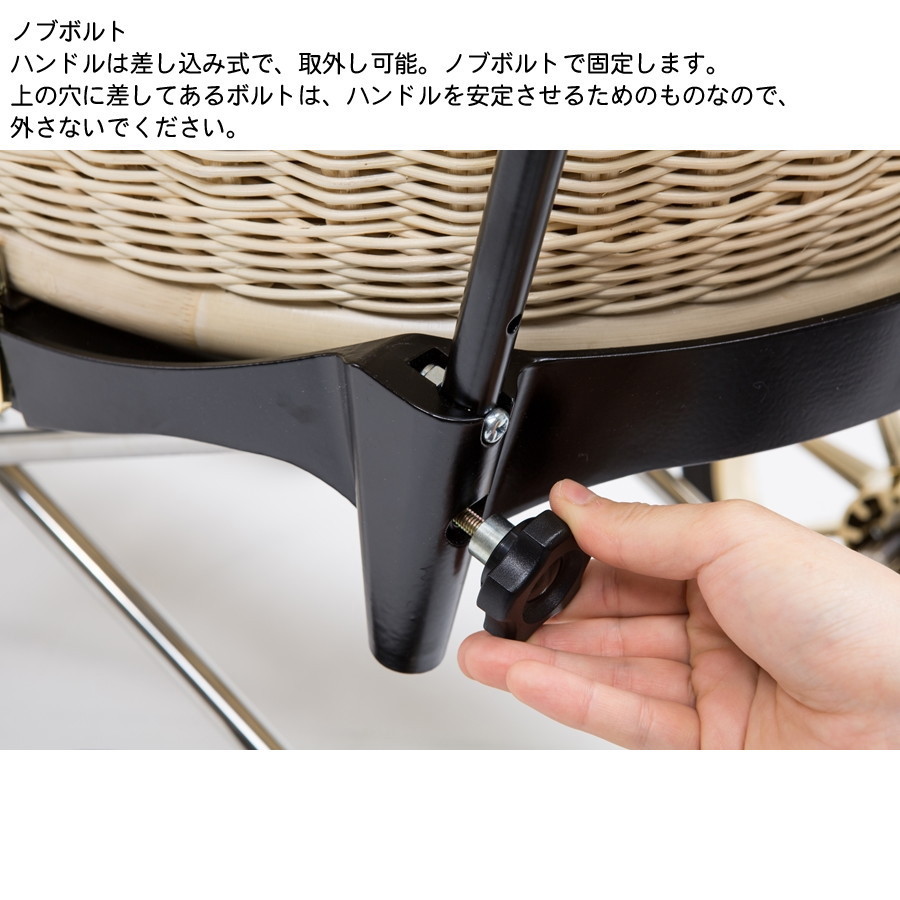 | 材質 | フレーム:アルミニウム 脚:ステンレス タイヤ:発泡プラスチック 車輪ハブ:ABS ハンドル:鉄パイプ グリップ:天然木 バスケット:籐(とう) 幌(ほろ):綿プリント |