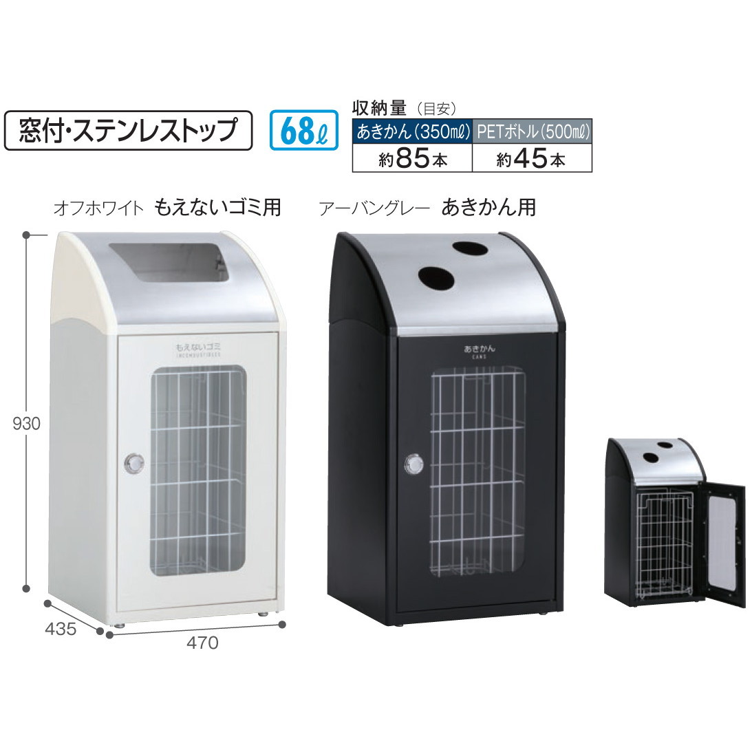 | 材質 | 本体:電気亜鉛メッキ鋼板に粉体塗装、ASA樹脂 投入口:ステンレス 中カゴ:スチール線材にポリエチレンコーティング 窓パネル:塩化ビニール |