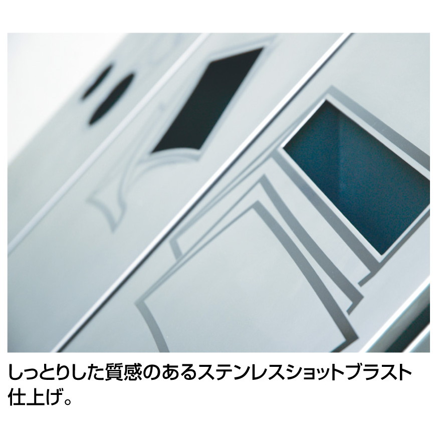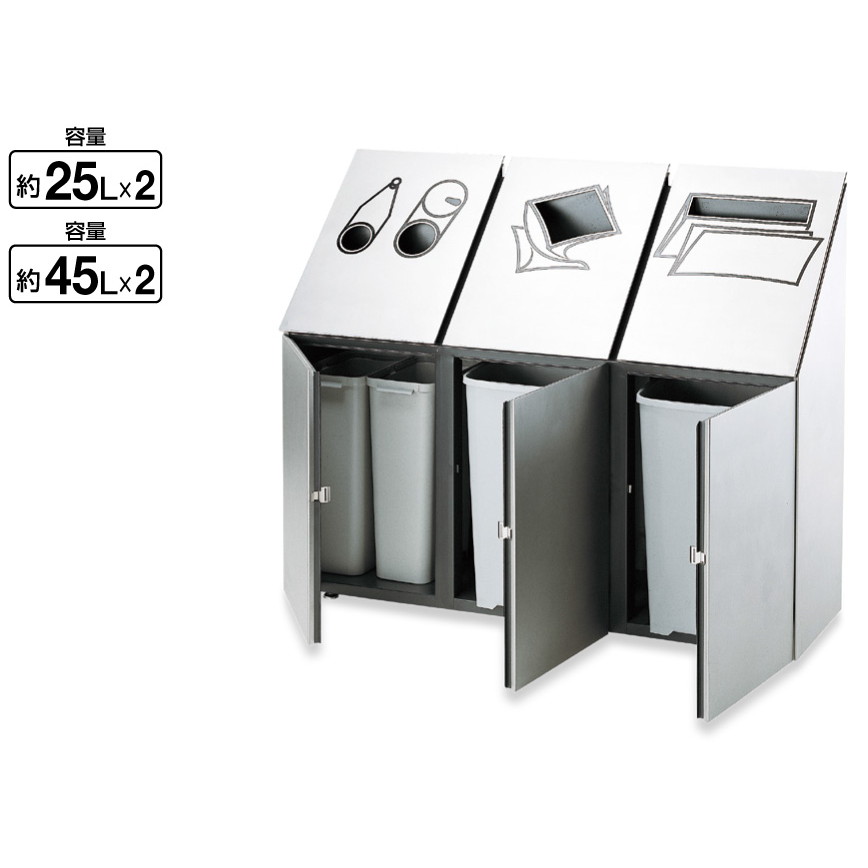 | 材質 | ボディ:スチールメラミン焼付 パネル:ステンレスショットブラスト 内容器:45L再生ポリプロピレン100%、25Lポリプロピレン イラスト:シルク印刷 |