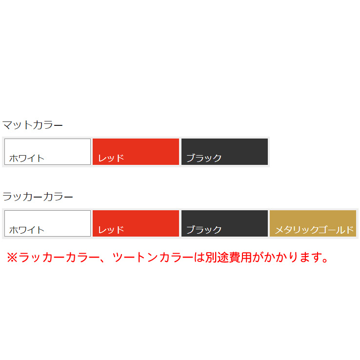 | カラー | マットカラー:ホワイト、レッド、ブラック ラッカーカラー:ホワイト、レッド、ブラック、ゴールド ※屋外での使用は紫外線や傷に強いマットカラーをお勧め致します。 ラッカーカラーは傷がつきやすい(目立ちやすい)為、屋外での使用はあまり向きません。 ラッカーカラーは艶のある仕上がりになります。別途見積りになりますのでご希望の方はお問い合わせください。 2色を利用したツートンカラーも別途見積りになります。 |