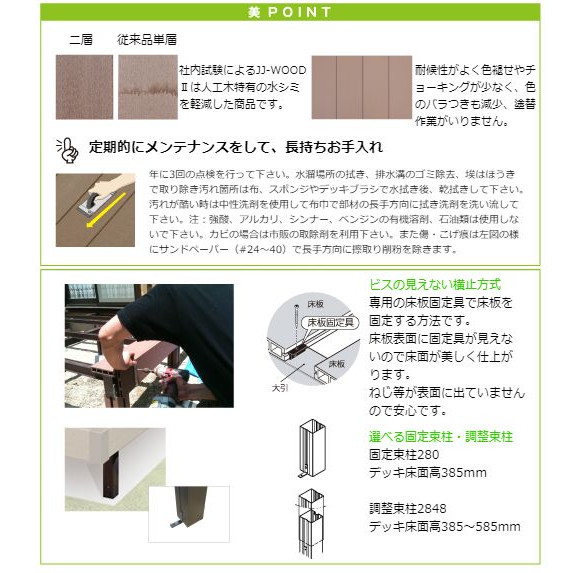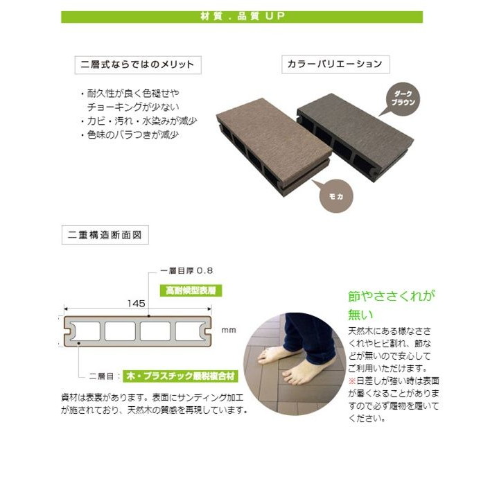 <その他の注意> ・木粉入り高密度樹脂製のため、熱変形することがあります。 ・日中の日差しが強い時は表面が熱くなる事がありますのでご注意下さい。 ・製品の特性上、隙間(目地)をあけての施工をお願いしておりますので隙間に指等を挟まないようご注意ください。 ・本製品表面に灯油、ガソリン、有機溶剤が付着した場合はすぐに拭きとってください。 ・本製品の上に空き缶や鉄製の物等をおいて、長時間放置しないでください。鉄の錆等でしみができる原因となります。 ・重量物を置かないでください。やむを得ず短時間だけ置く場合は敷板等を置いて、荷重が分散するようにしてください。 ・本製品は製造時に発生した粉や繊維状のものが表面に残っている場合があります。
