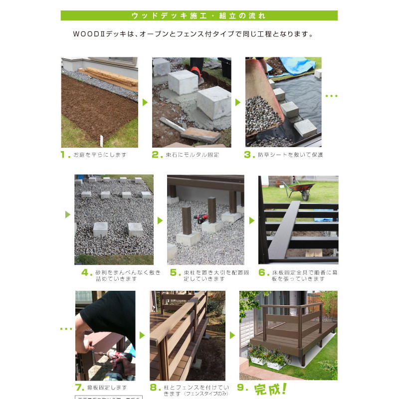 ・商品は重量物になり、運送中に破損する恐れのある部材もございます。商品が届きましたら、中身のご確認をお願いします。 ・土台に使用するコンクリート平板等は、ホームセンターなどでお客様ご自身でご用意いただきます。 ・ステップ(別売)もデッキと同様に、コンクリート平板等をご用意ください。