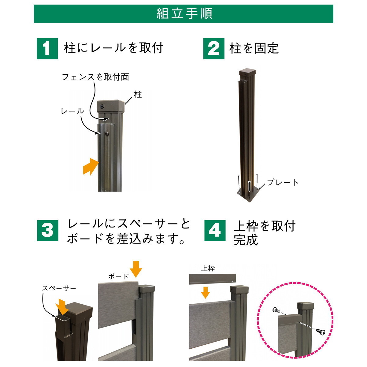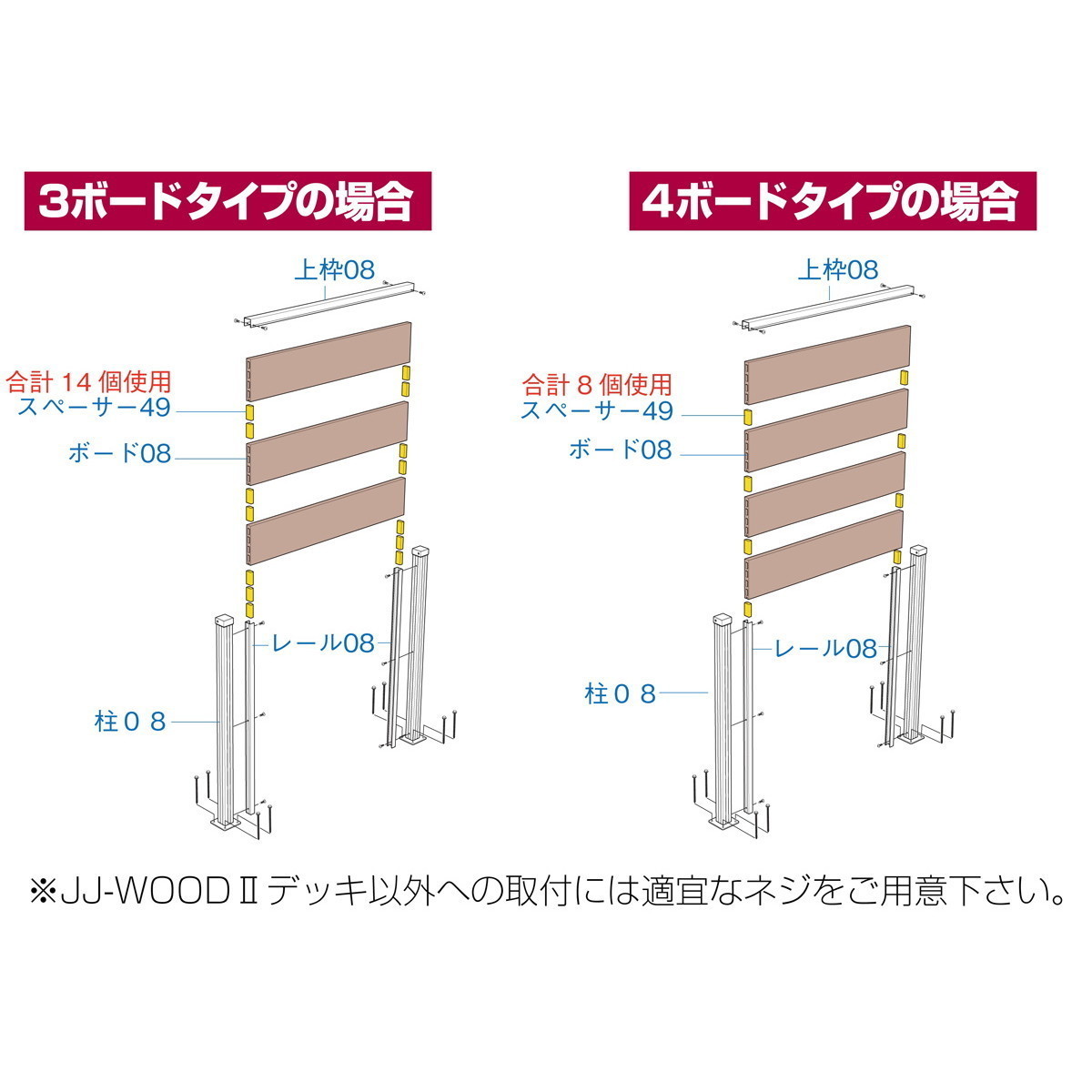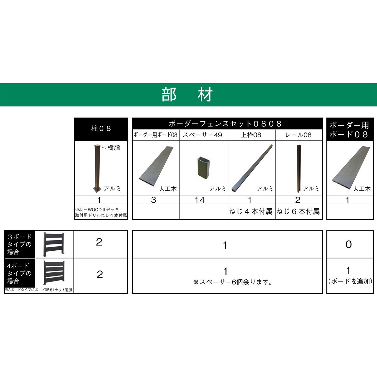 4枚タイプの場合 ・柱×7 ・フェンスセット(ボーダーフェンス3枚入り)×6 ・追加ボーダーフェンス×6