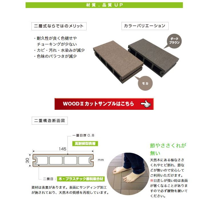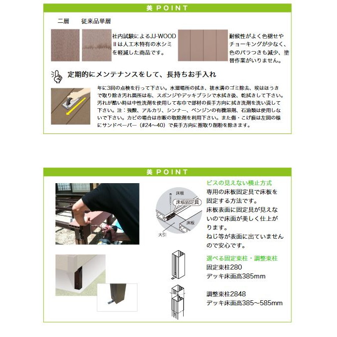 <その他の注意> ・木粉入り高密度樹脂製のため、熱変形することがあります。 ・日中の日差しが強い時は表面が熱くなる事がありますのでご注意下さい。 ・製品の特性上、隙間(目地)をあけての施工をお願いしておりますので隙間に指等を挟まないようご注意ください。 ・本製品表面に灯油、ガソリン、有機溶剤が付着した場合はすぐに拭きとってください。 ・本製品の上に空き缶や鉄製の物等をおいて、長時間放置しないでください。鉄の錆等でしみができる原因となります。 ・重量物を置かないでください。やむを得ず短時間だけ置く場合は敷板等を置いて、荷重が分散するようにしてください。 ・本製品は製造時に発生した粉や繊維状のものが表面に残っている場合があります。