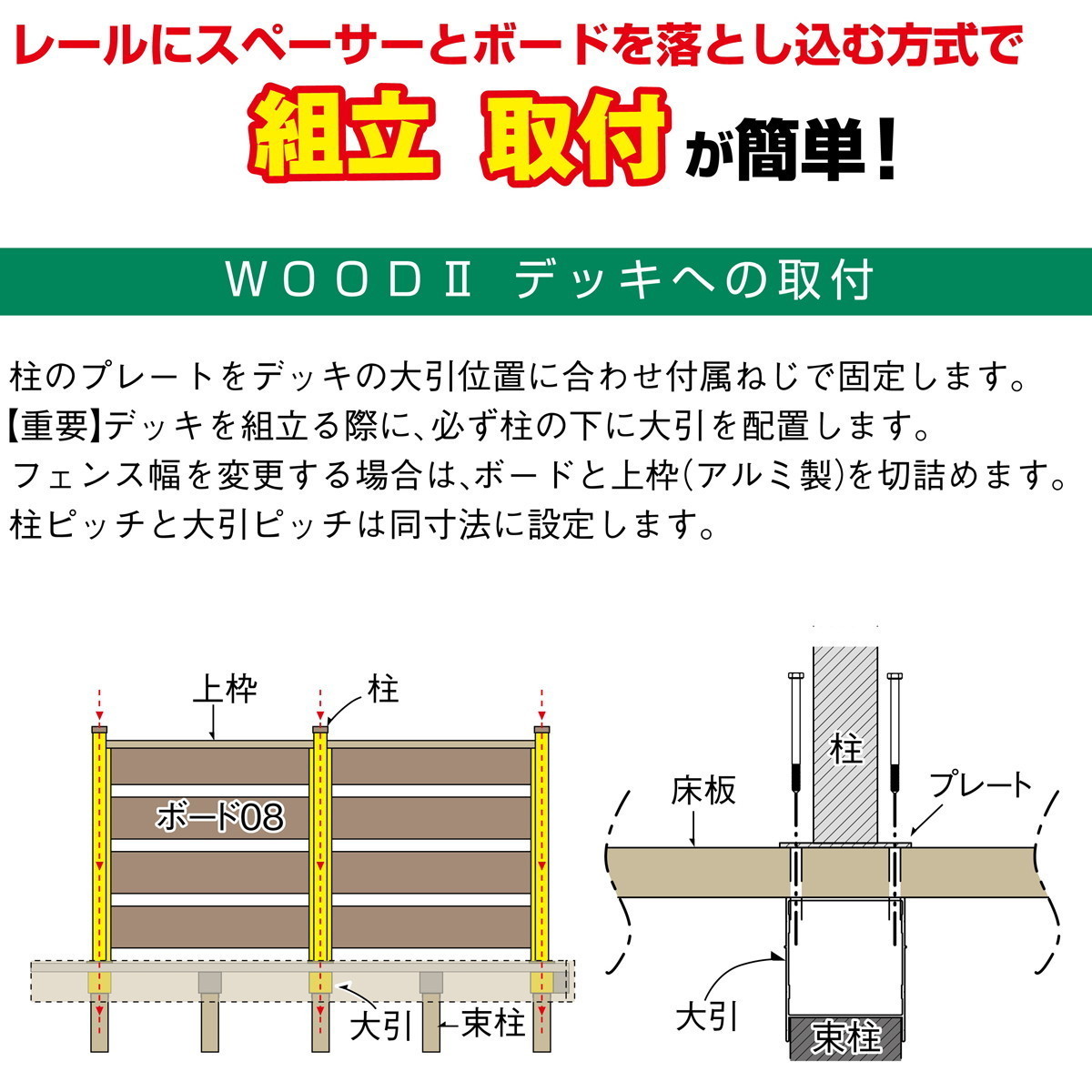 | タイプ | 固定束280:デッキ床面高さ385mm 調整束2848:デッキ床面高さ385~585mm ※調整ができます ※若干異なる場合がございます。 |