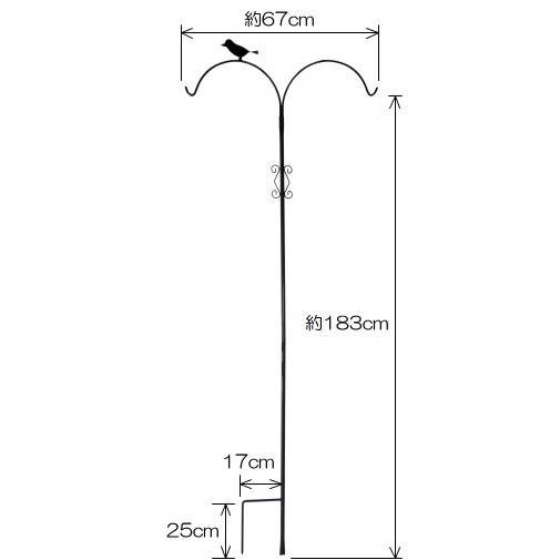 | 備考 | ・耐荷重:吊り下げアーム部 3kg×2箇所 ・差込部(250mm)土中に埋め込んで使用してください。 ・商品の色はPCと異なって見える場合があり、またPCによっても異なります。色がイメージと異なるという理由では返品は承りかねますので、予めご了承ください。 |