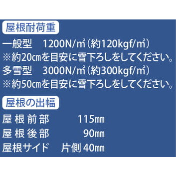| 耐荷重 | 床:4540kg、ZAM床パネル6000N/㎡(約600kgf/㎡) 一般型屋根:1200N/㎡(約120kgf/㎡)・積雪約20cm以下 多雪型屋根:3000N/㎡(約300kgf/㎡)・積雪約50cm以下 ※積雪強度を守り早めに雪おろしをしてください。 |