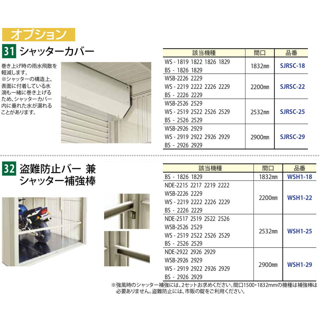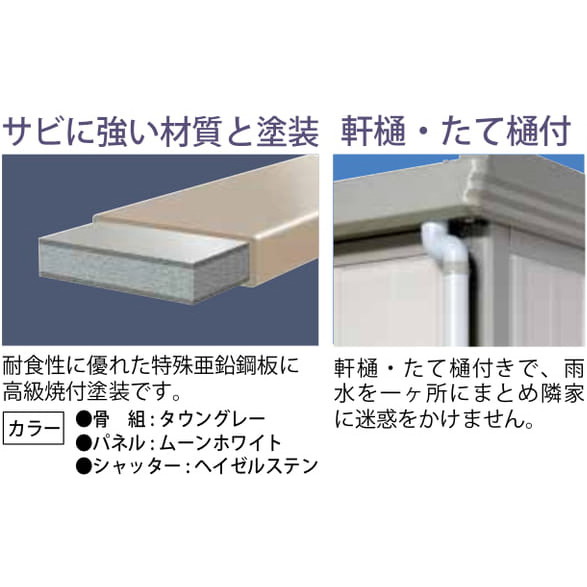 | 材質 | 床枠、コーナー柱後、中間柱左右後、後上枠、母屋、化粧板左右、前化粧板、軒樋:ZAM(ポリエステル系樹脂塗装) 根太、床パネル:ZAM コーナー柱前、パラペット、前上枠、壁パネル:亜鉛鉄板(ポリエステル系樹脂塗装) 屋根パネル:ガルバリウム鋼板(ポリエステル系樹脂ロールコート) シャッター、レール:亜鉛鉄板(ポリエステル系樹脂ロールコート) 竪樋:AAS樹脂 ※多雪地用(S型)は、母屋の高さが115mmで板厚t1.6となります。 ※結露減少型(Z型)は、屋根パネルの裏面に発泡ポリエチレン貼りとなります。 |
