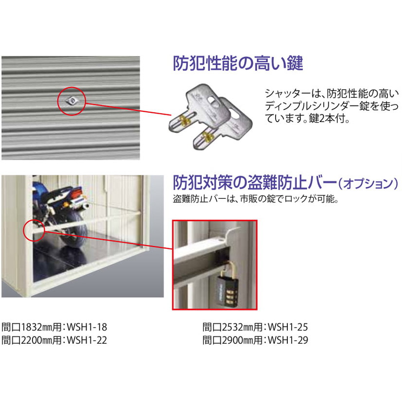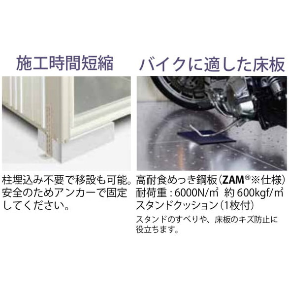 ●風雨やホコリ、黄砂、紫外線はもちろん、愛車を守る防犯を配慮した安心設計。床付きでシャッター式のバイクガレージです。