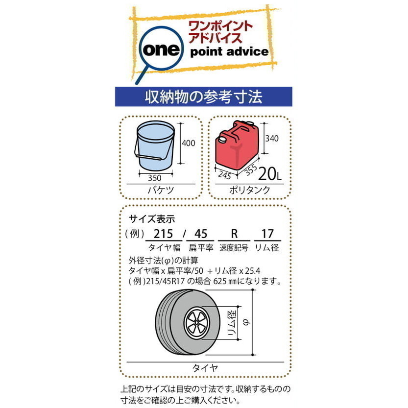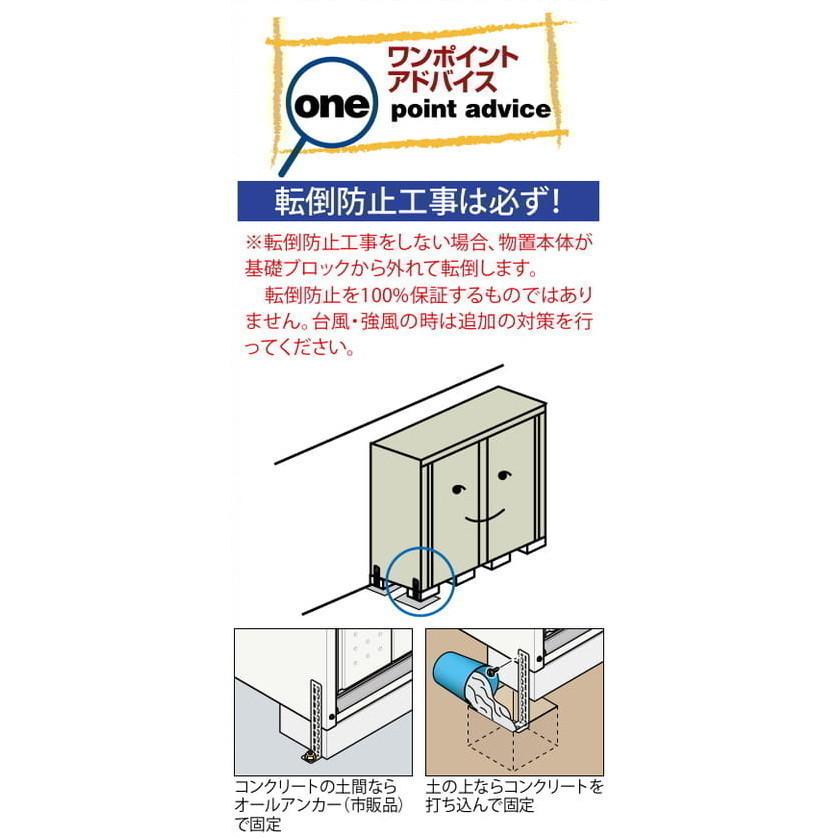 | 耐荷重 | 床:359kg 棚板:F-17W 66kg、T-17W 104kg ネット棚:N-40W 28kg 屋根:1200N/㎡(約120kgf/㎡)・積雪約20cm以下 ※積雪強度を守り早めに雪おろしをしてください。 |