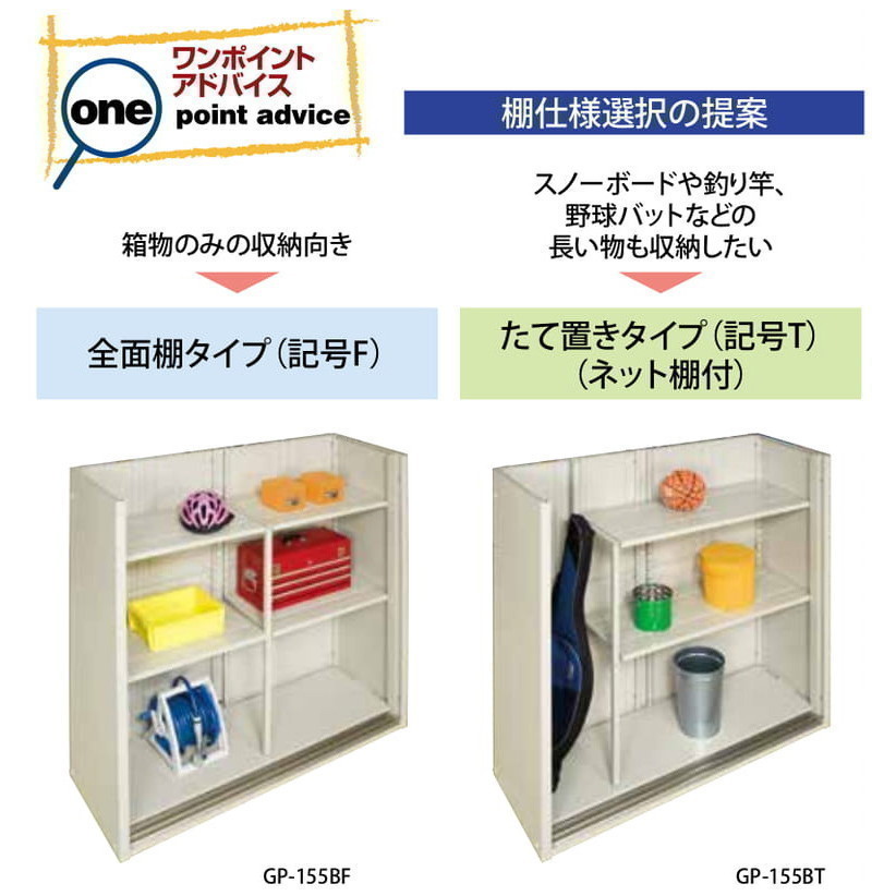 ●コンパクトタイプの物置です。全面棚タイプか、たて置きタイプかを選択できます。全面棚タイプは、横幅いっぱいに収納が可能。たて置きタイプは、スキー板やバットなど長物が収納できます。
