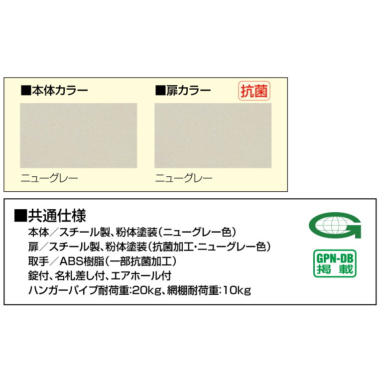 | 備考 | ・シリンダー錠付きです。 ・1人用です。 ・一部の取手、錠前、扉は抗菌加工がしてあります。 ・ハンガーパイプ、網棚、鏡、ネクタイかけ、傘立、滴受、Sカンが付属しています。 ・商品の色はPCと異なって見える場合があり、またPCによっても異なります。色がイメージと異なるという理由では返品は承りかねますので、予めご了承ください。 |