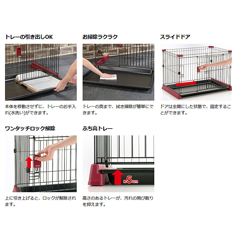 ●前面のフレームがないのでトレーの出し入れが簡単に行えるペットサークルです。